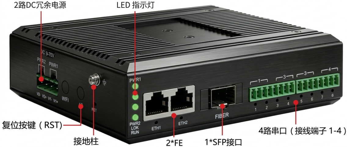 FCT-1400 系列是一款专为工业现场设计的高可靠串口联网服务器,支持 1–4 路 RS-232/RS-422/RS-485 转 2 路百兆以太网 + 1 路百兆光口(交换式),可将分散的串行设备通过网络集中管理。