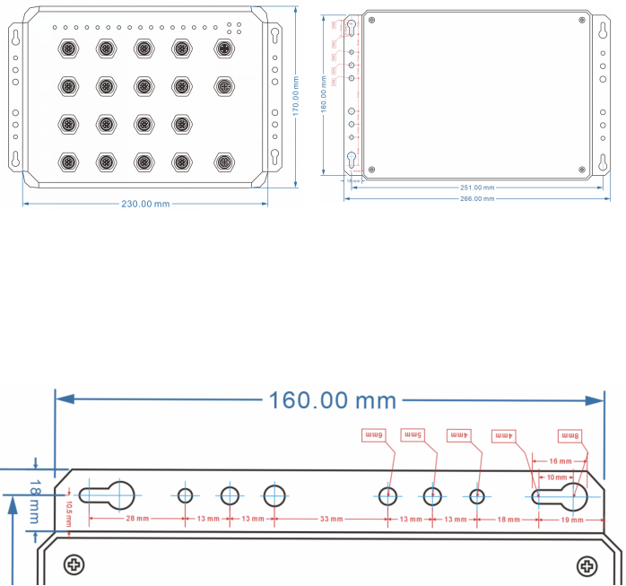 铝合金CNC外观结构: 230mm(长) x 170mm(宽) x 44.0mm(高) ,IP68防护 6(完全防止外物及灰尘侵入),8(电器无限期沉没在指定的水压下,可确保不因浸水而造成损坏) |
