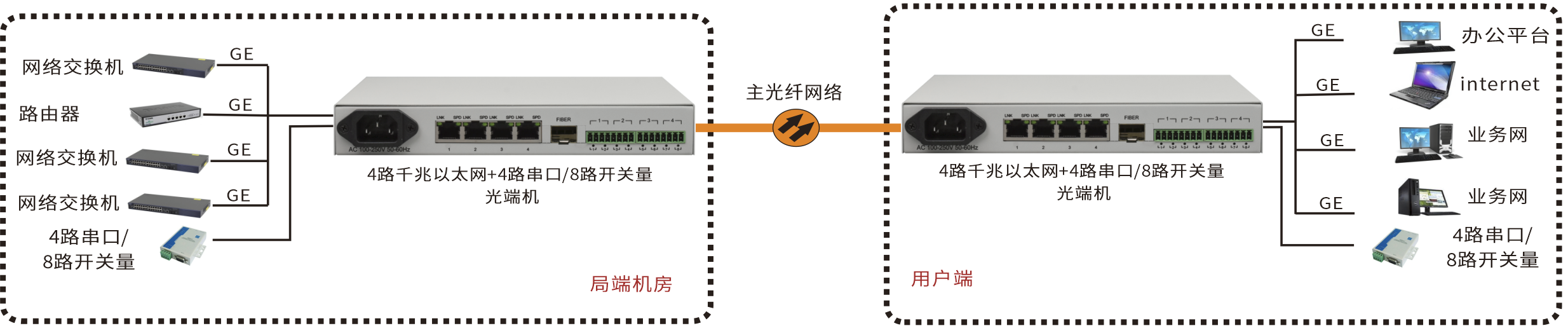 | 业务端口描述 | 1-8路开关量接口/1-4路RS232-422-485接口;4路千兆以太网接口,1个光纤接口 |