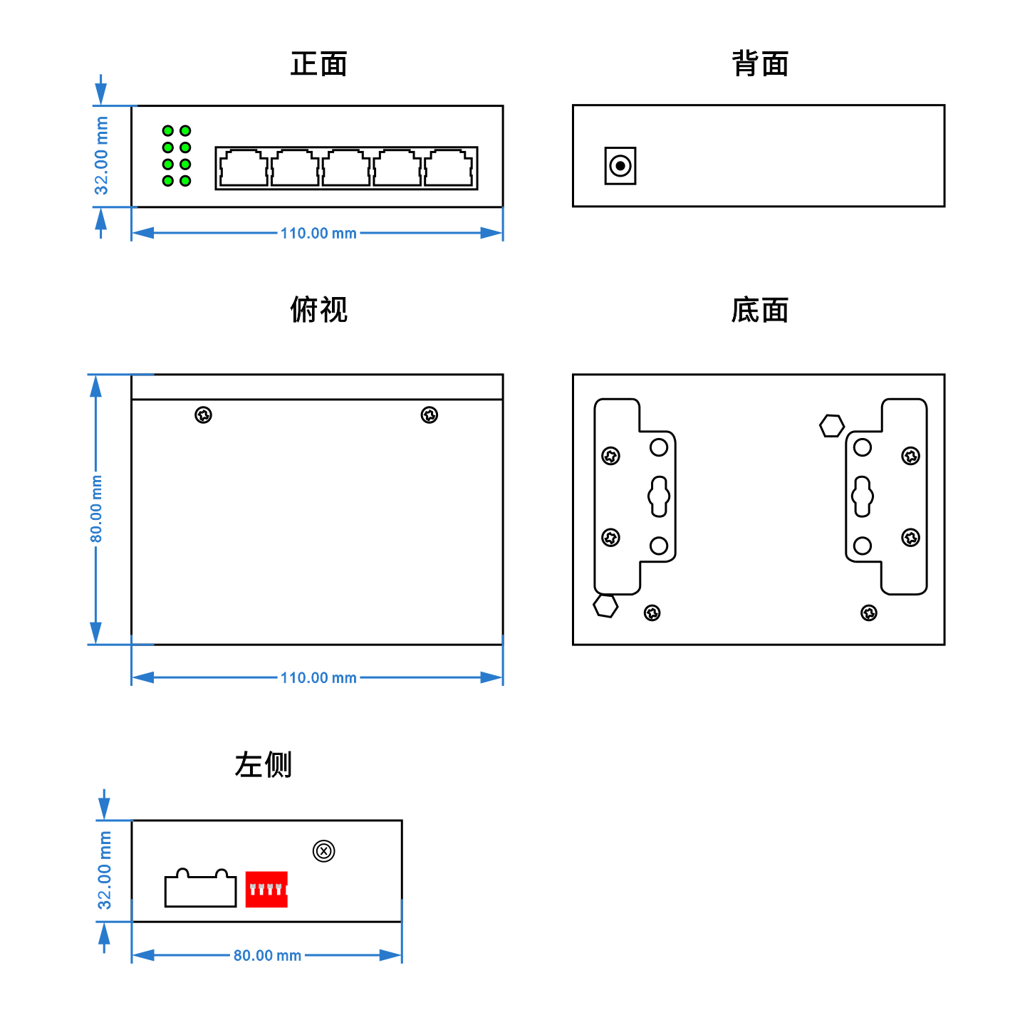 (110mm(长) x 80mm(宽) x 30mm(高) 安装方式:导轨安装、壁挂式安装 |