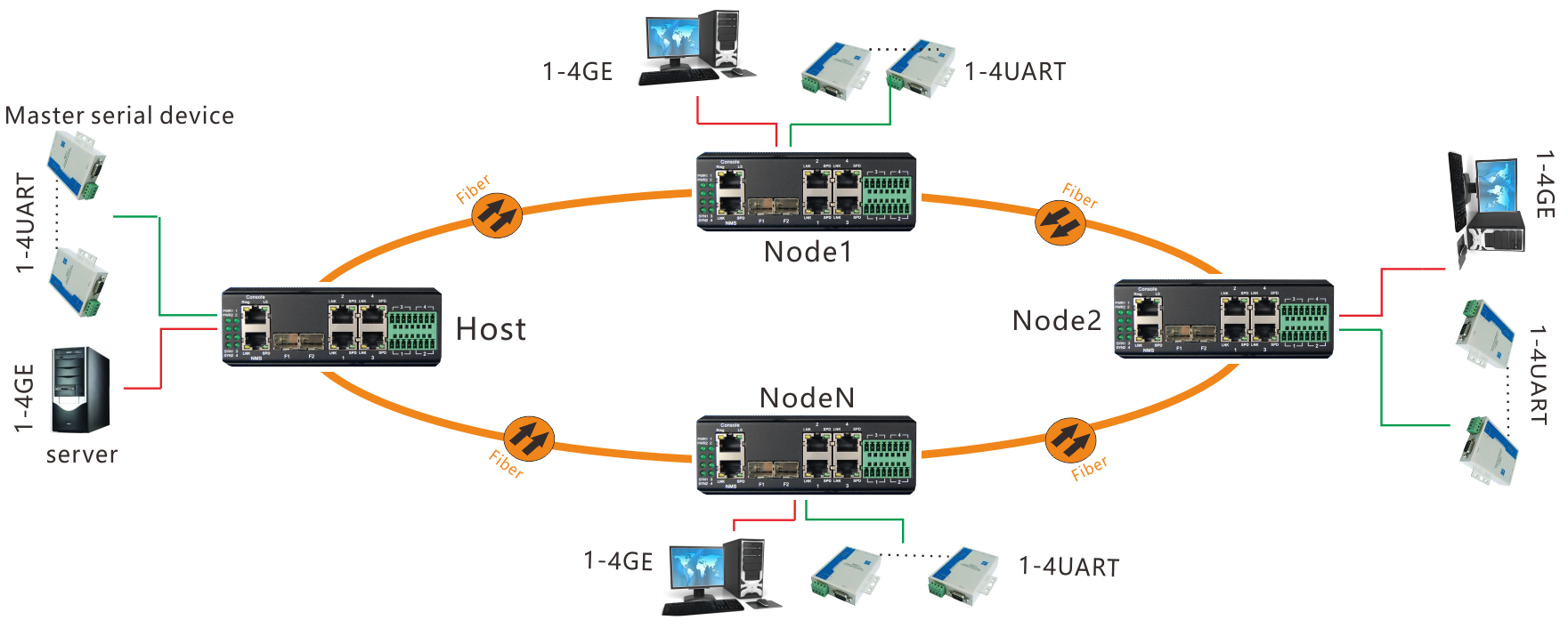 Support a variety of fiber network structure: point to point star chain ring network redundancy and can be combined for more complex network topology to support a variety of fiber network structure;