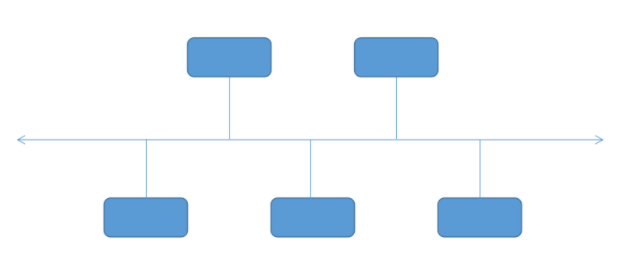 总线拓扑结构是将网络中的各个节点设备用“一根总线”连接起来,实现计算机网络的功能。任何连接在总线上的设备都能在总线上发信号,并且所有设备都能接收信号。总线型拓扑结构图如下: