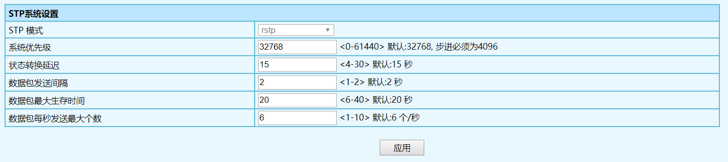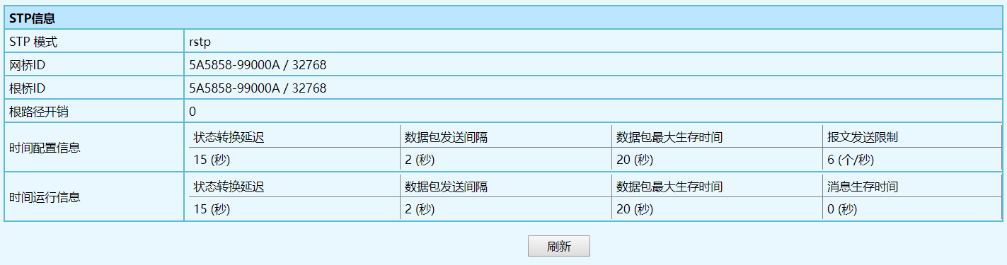 | STP 模式 | 当前的 STP 模式,支持 RSTP,兼容 STP |