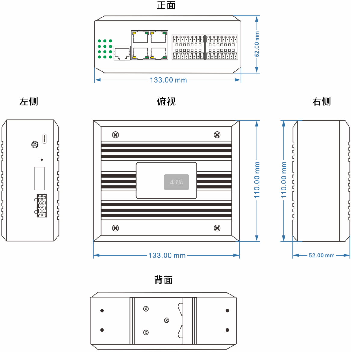外壳:IP40防护等级,铝合金材质 尺寸:133mm(长) x 110mm(宽) x 52.0mm(高) 装方式:导轨安装、壁挂式安装 |