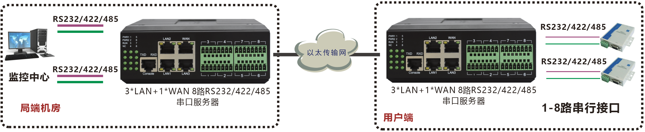 | 产品功能描述 | 在3路千兆LAN接口与1路千兆WAN接口上传输8路RS232/422/485串口,工业轨式 |