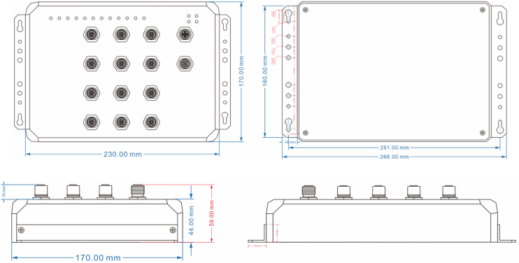 外壳:IP68防护等级,铝合金材质 尺寸:230mm(长) x 170mm(宽) x 44.0mm(高) 安装方式:壁挂式安装 |