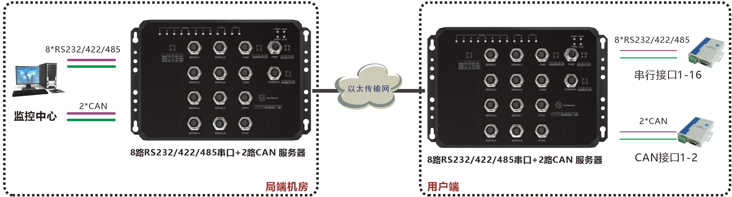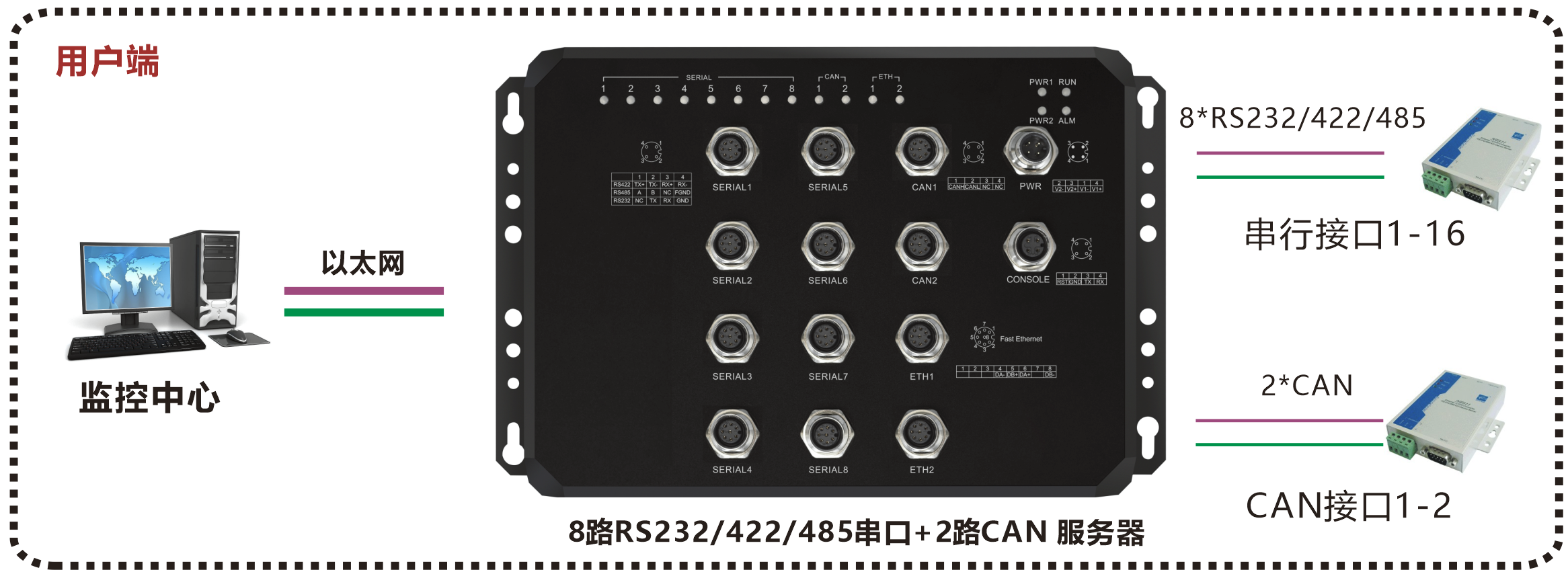 | 产品功能描述 | M12接口 以太网上传输8路RS232/422/485串口+2路CAN接口 |