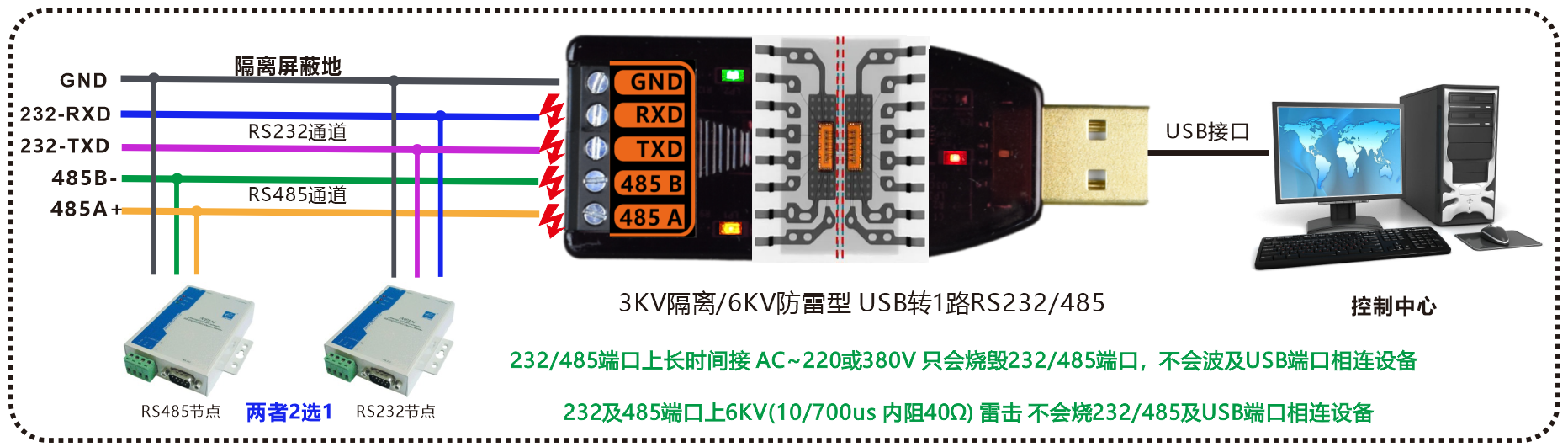 ◆ RS232/485串口带3KV隔离当长时间接入AC~220V或AC~380V高压时只烧RS485接口,不烧USB口及相连设备。