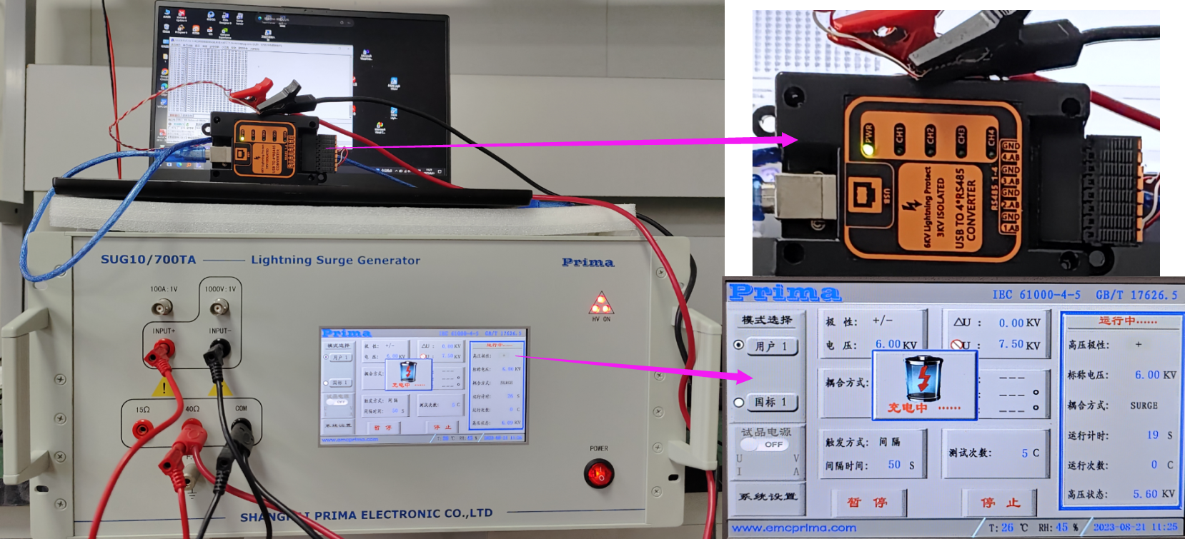USB直接连电脑雷击测试:4*RS485接口可过:短路电流波10/700μs开路峰值电压6KV内阻40Ω的雷击测试