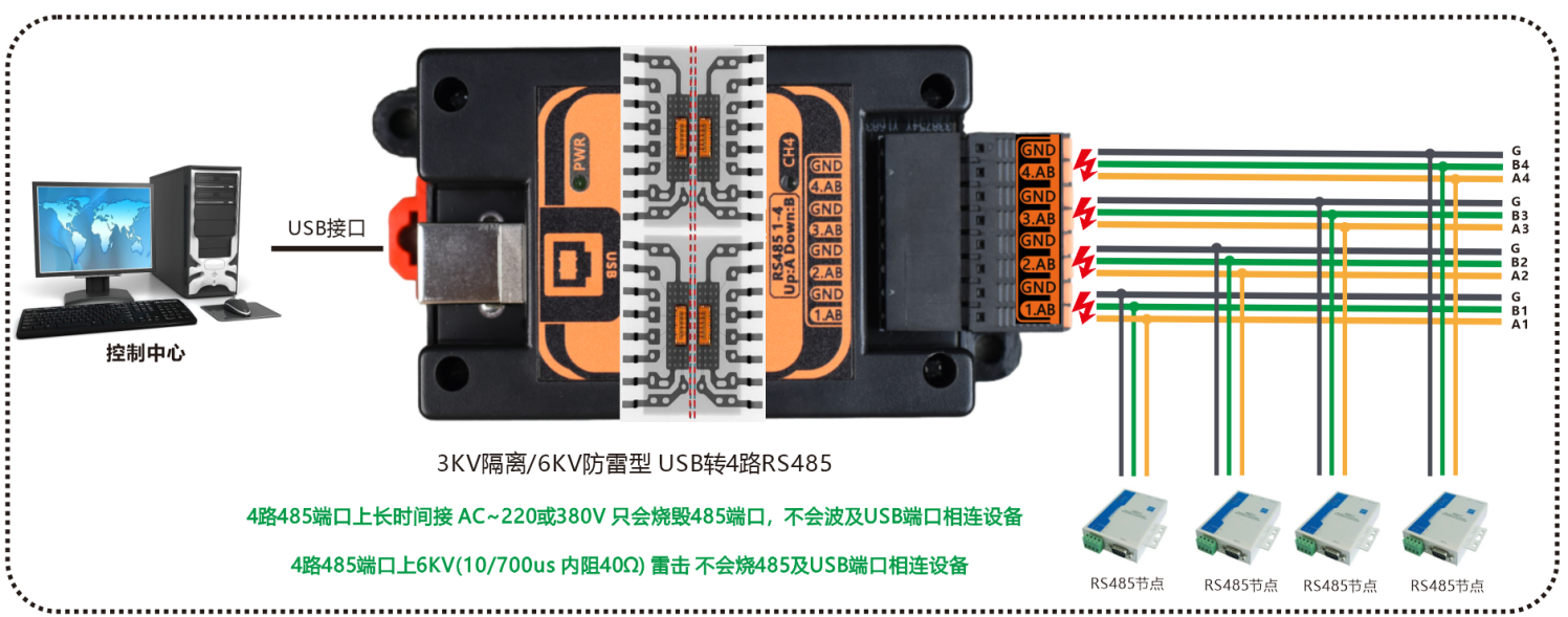 4路RS485串口与USB接口带3KV隔离当长时间接入AC~220V或AC~380V高压时只烧RS485接口,不烧USB口及相连设备