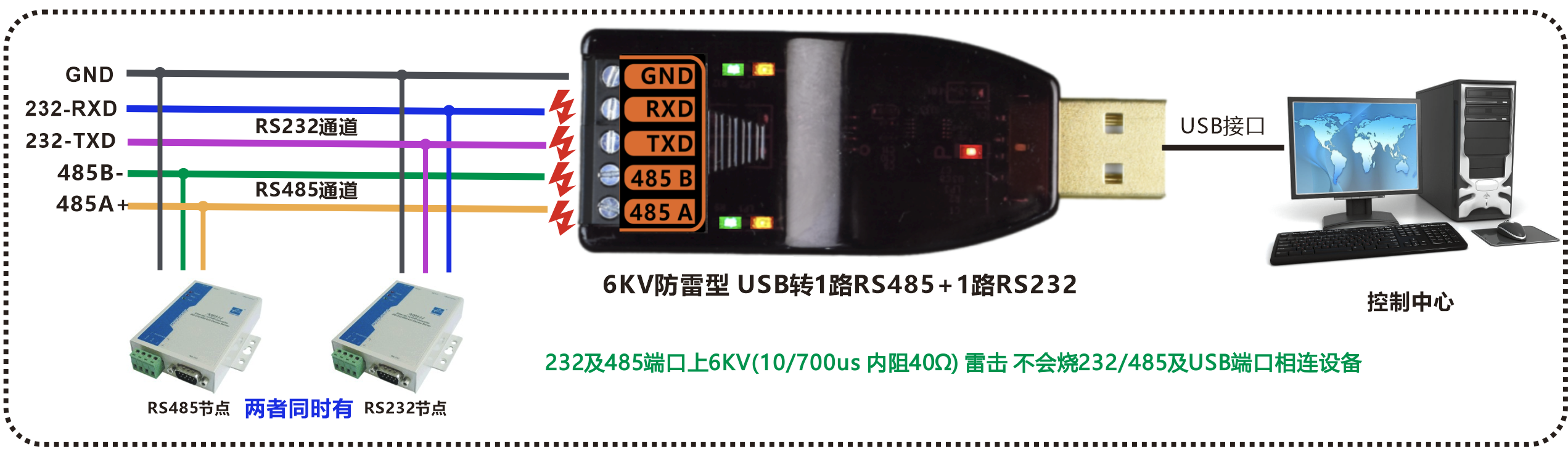 | 产品功能描述 | 防雷型USB转1路高速RS485+1路RS232转换器 |