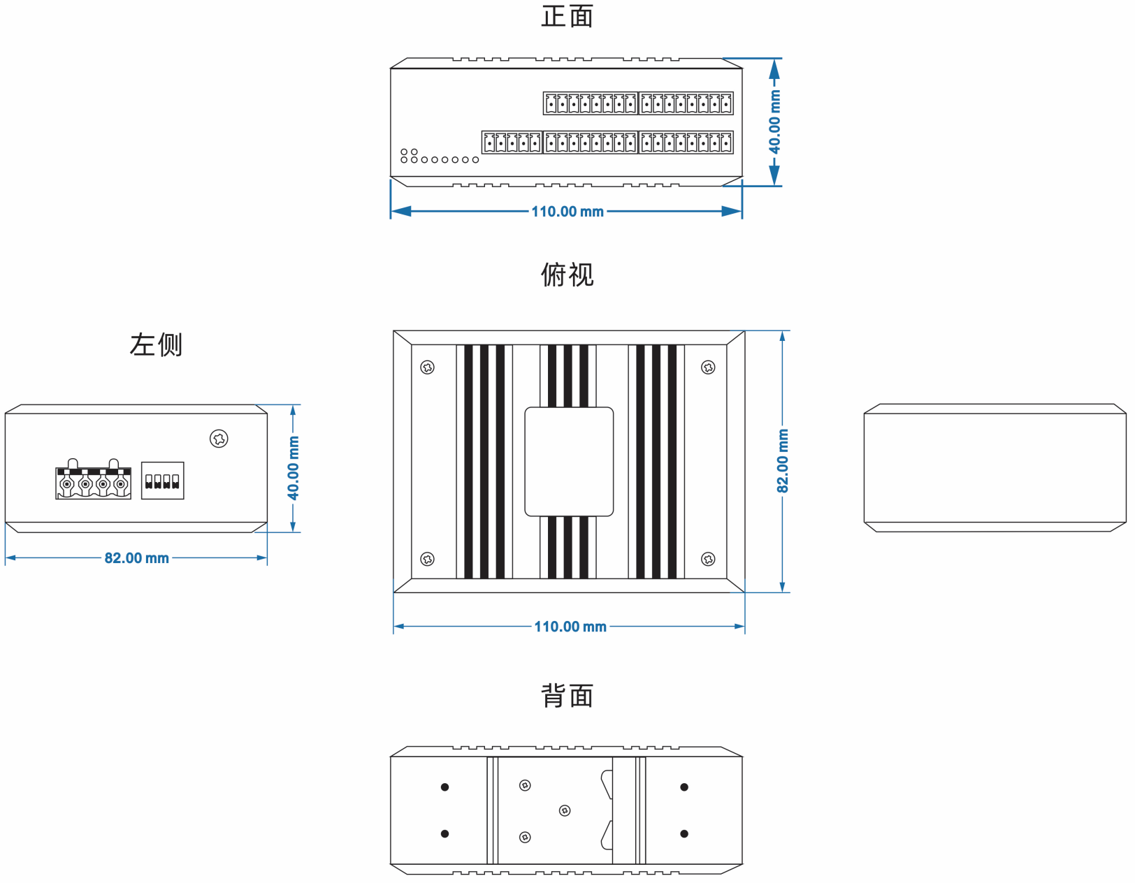 外壳:IP40防护等级,铝合金材质 尺寸:110mm(长) x 86mm(宽) x 40.0mm(高) 装方式:导轨安装、壁挂式安装 |