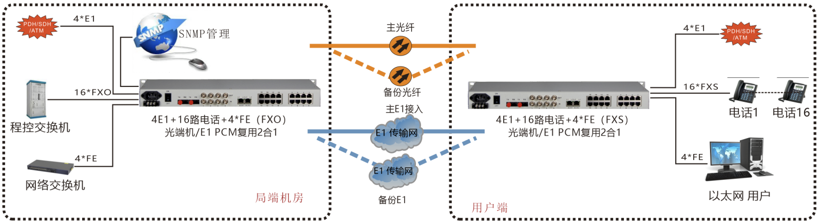 本系列产品,是在该公司研制的专用超大规模集成电路的基础上,研发的点对点光传输与E1 PCM复用设备二合一产品。此款产品光纤传输时提供16路电话接口+4路E1接口+4路百兆以太网接口(100M带宽),在E1传输入时提供16路电话接口+4路百兆以太网接口(1M带宽);光纤可以1+1备份,E1可以1+1 备份,优先级为主光纤>备份光纤>主E1>备份光纤。