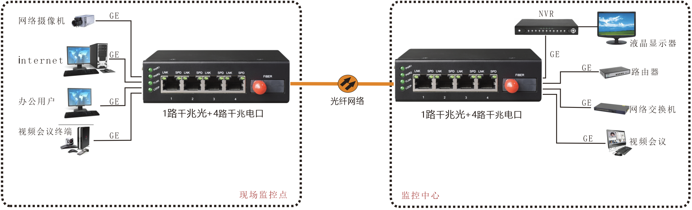 | 产品功能描述 | 1路千兆光口转4路10/100/1000M以太网电口,工业轨式 |