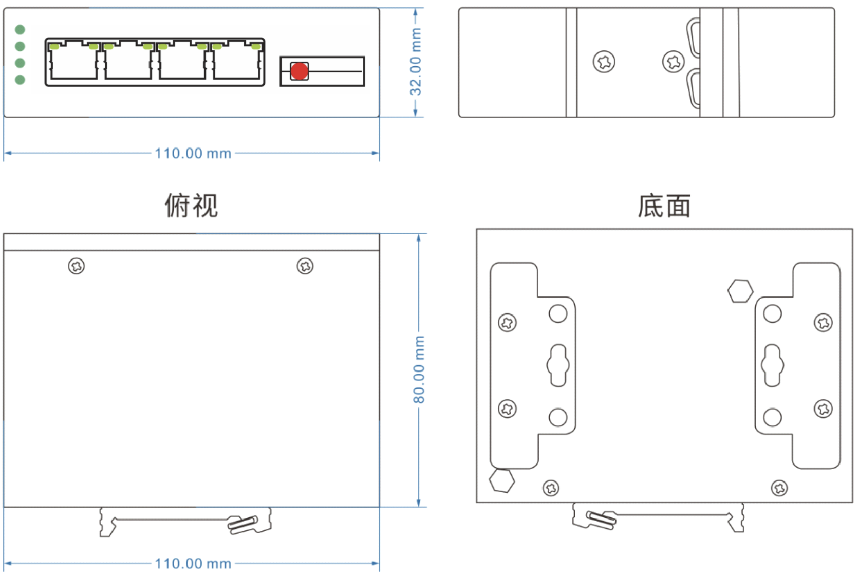 外壳:IP40防护等级,钢材质 尺寸:110mm(长) x 80mm(宽) x 32mm(高) 安装方式:导轨安装、壁挂式安装 |