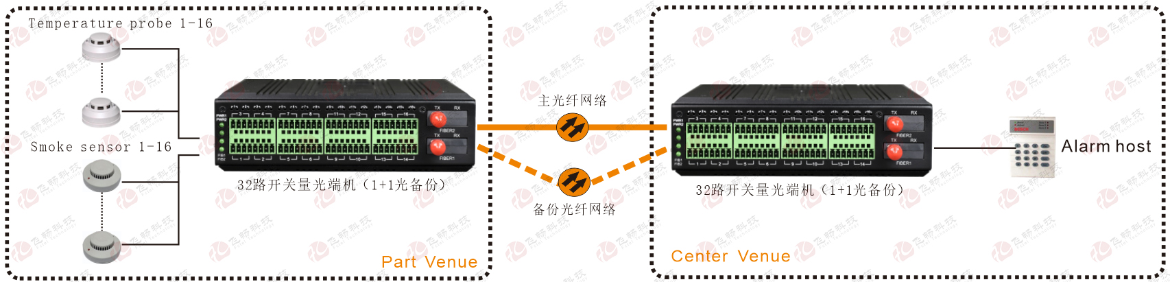 | 产品功能描述 | 工业轨式 32路开关量 1+1光纤备份光端机 |