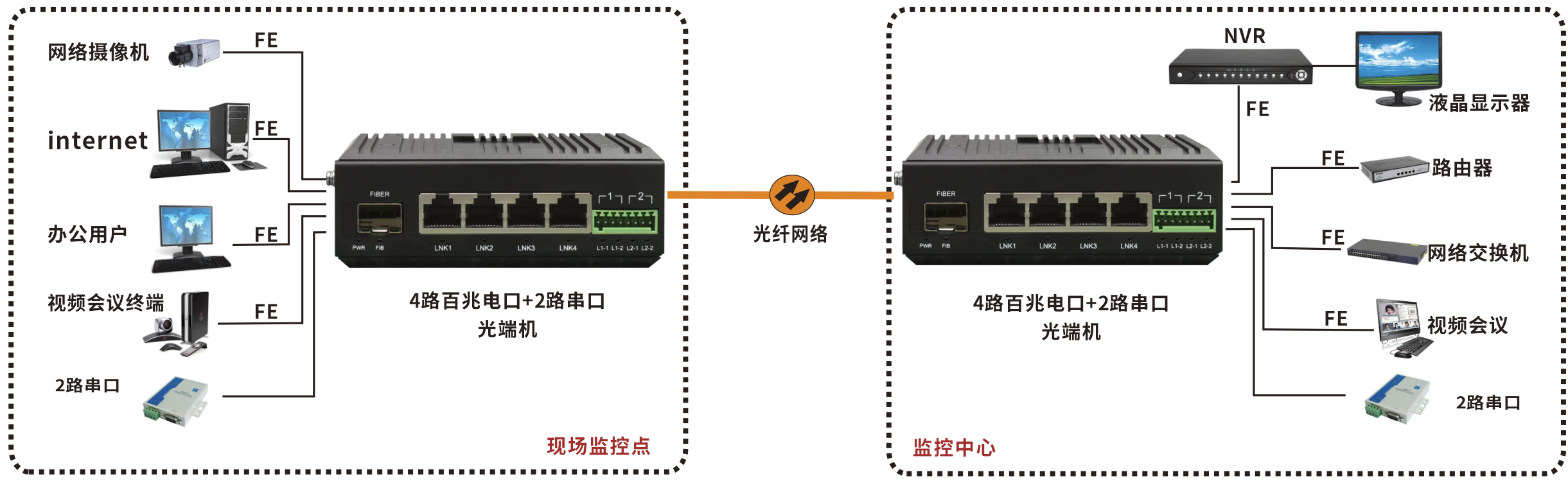 本产品是以太网IEEE802.3介质转换器,设备带4个百兆以太口,百兆以太网接口为线速100M的带宽,光纤距离(20/40/60/80/120公里),设备还带2个RS232/422/485可选串口或4路开关量;