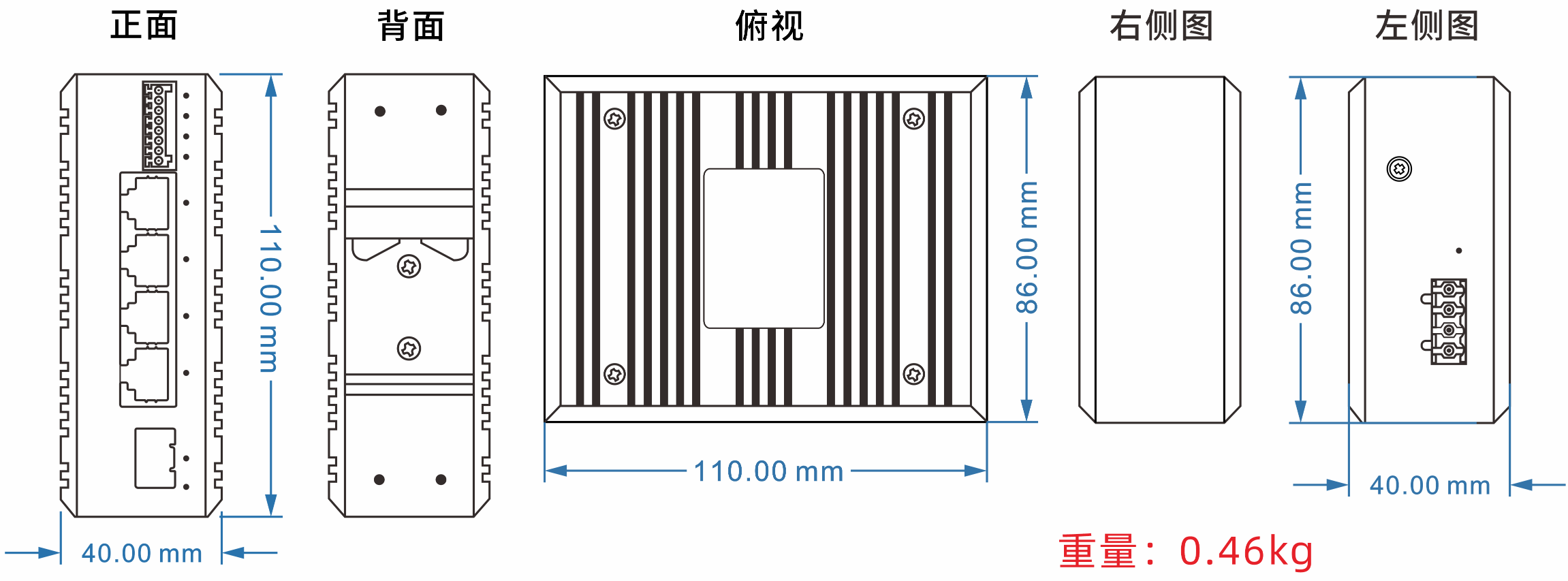 外壳:IP40防护等级,铝合金材质 尺寸:110mm(长) x 87mm(宽) x 40mm(高) 安装方式:导轨安装、壁挂式安装 |