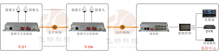 本产品均由光节点机和光接收机组成,节点机最多可同时传输2路正向视频和1路RS485数据,接收机最多可接收16路视频和1路RS485数据,一芯光纤链路最多可串接16个节点。